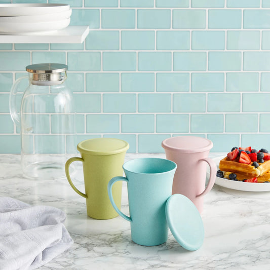 6 Pack Wheat Straw Mugs with Handles, Lids, Unbreakable Coffee Cups, Microwave and Dishwasher Safe (3 Colors, 15 Oz)